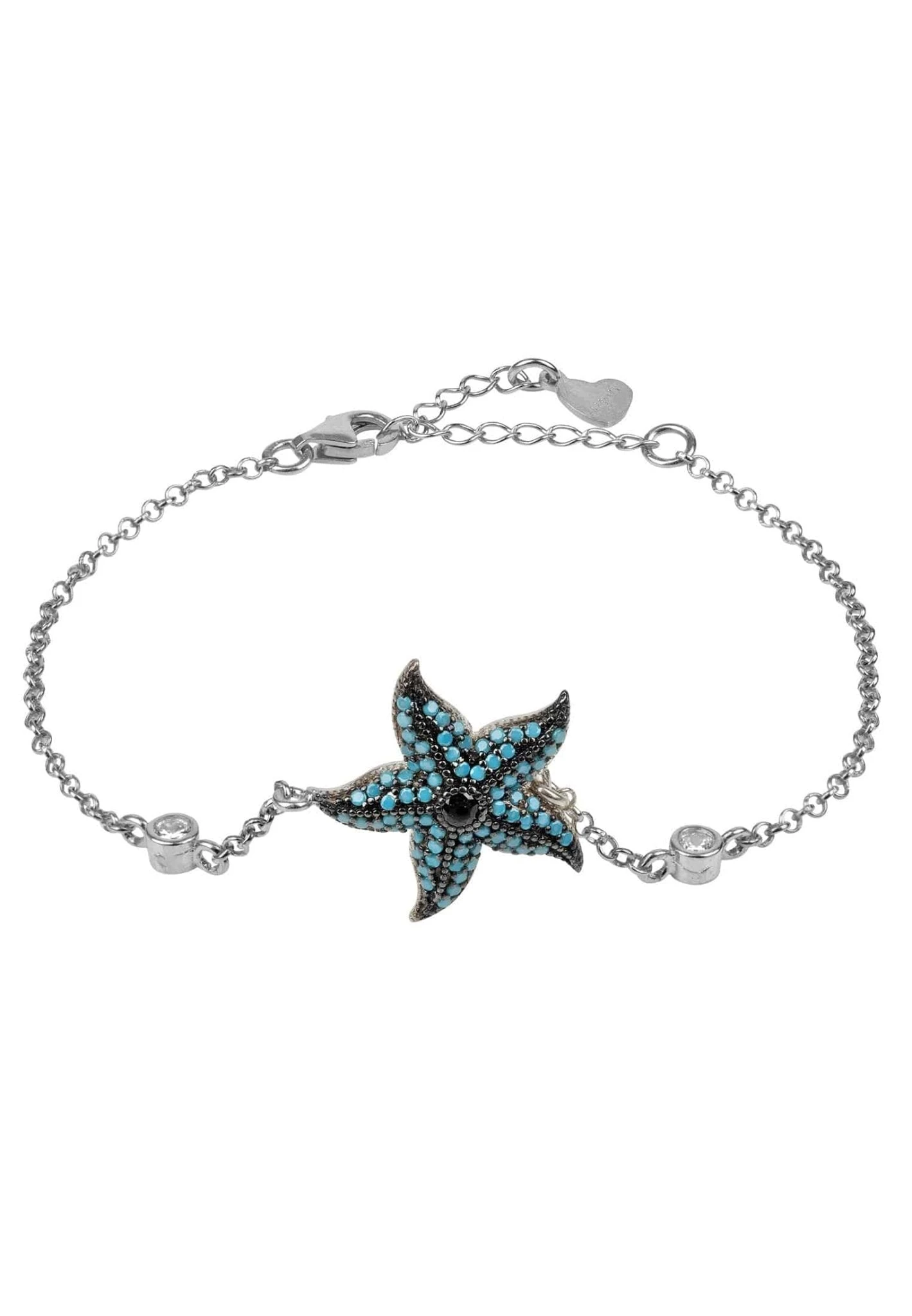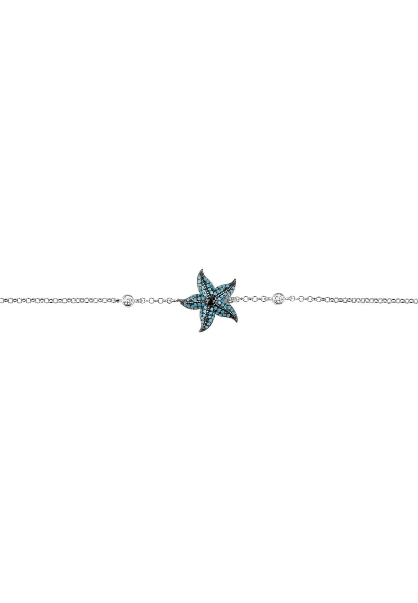 Great for everyday styling, this pretty and fun, animal inspired bracelet features a turquoise adorned starfish, on a fine chain, framed either side by a single white zircon for added sparkle, with lobster clasp fastening.