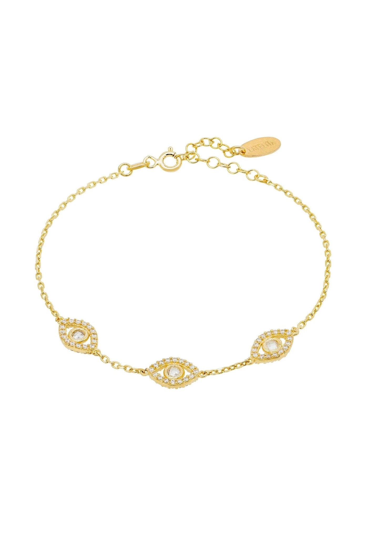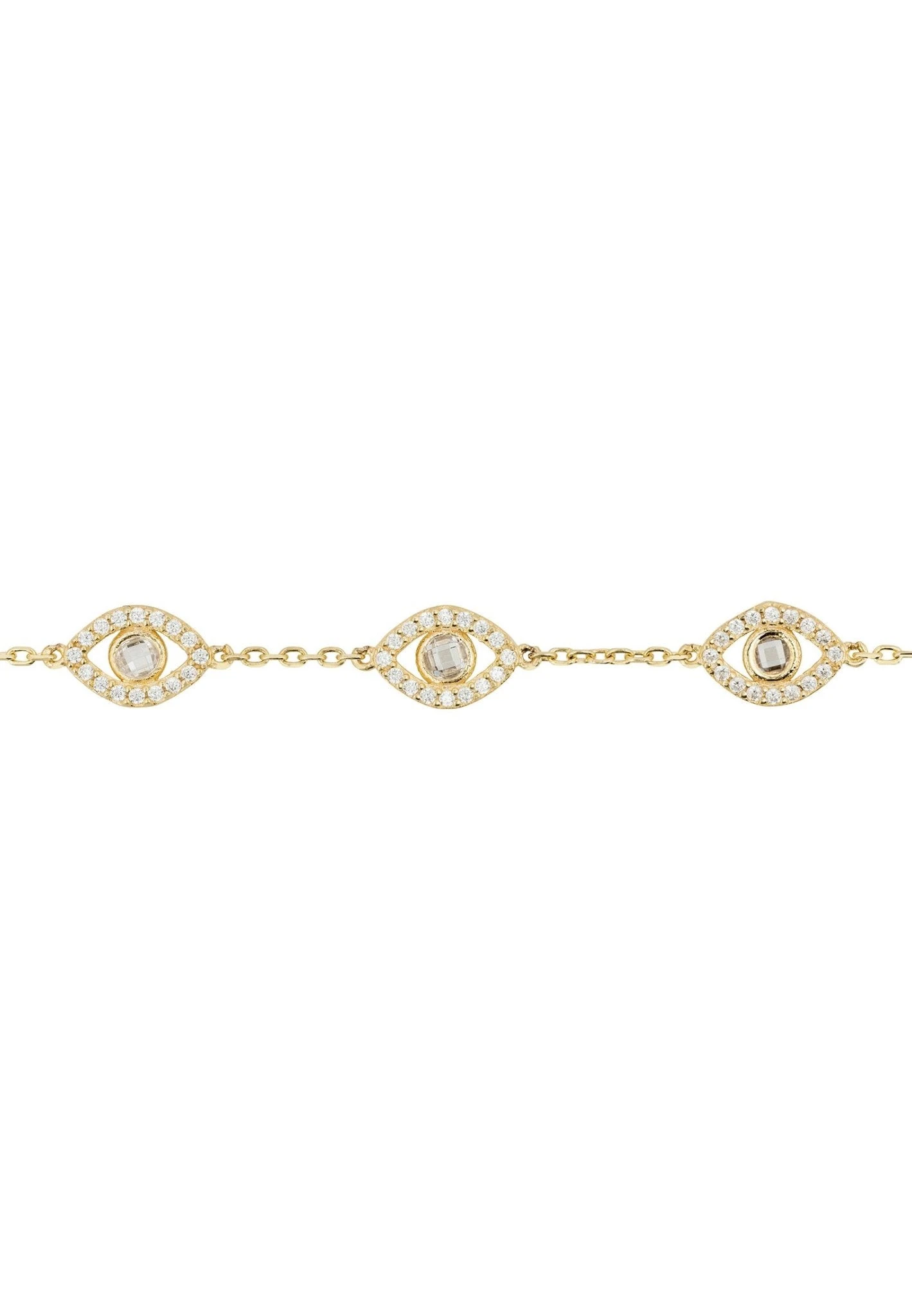 Style enthusiasts and those who desire to infuse their wardrobe with mysticism will be absolutely enamoured by the Triple Elliptical Eyes Bracelet. Beautifully crafted from 925 sterling silver dipped in 22ct gold, this sensational bracelet is adorned with three dazzling elliptical evil eyes. Each of these mystical motifs is outlined with sparkling cubic zirconia, with a larger stone at its centre, making sure you stand out in style whilst keeping those negative vibes at bay.