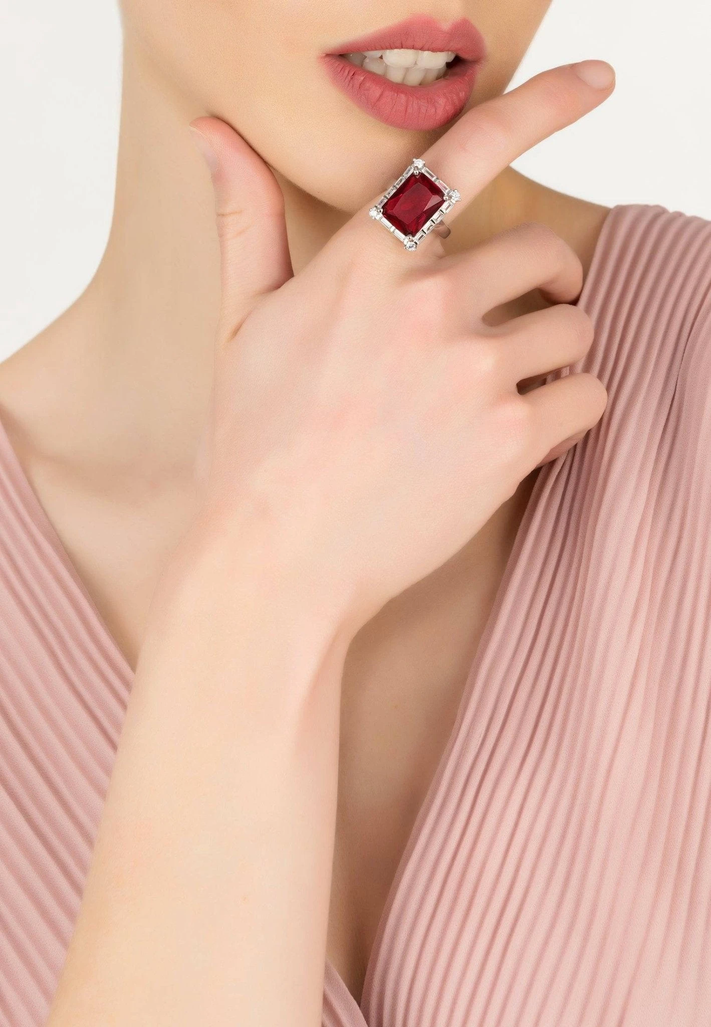 The beautiful design of the Tudor ring, features a large rectangular shaped cultured Ruby surrounded in its setting with baguette cut white zircons for added sparkle and glitz.